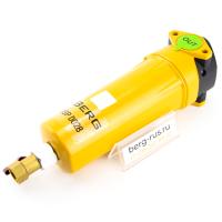 Самый экономичный способ повысить качество очистки сжатого воздуха, выходящего из винтового или поршневого компрессора. Внутри колбы сепаратора расположена турбина, имеющая специальную резьбу для того, чтобы проходящий через нее сжатый воздух получил вращательное вихревое движение. Центробежная сила отбрасывает капли масла и влаги к боковой поверхности цилиндра сепаратора, вода и масло оседают на ней и стекают в нижнюю часть корпуса.