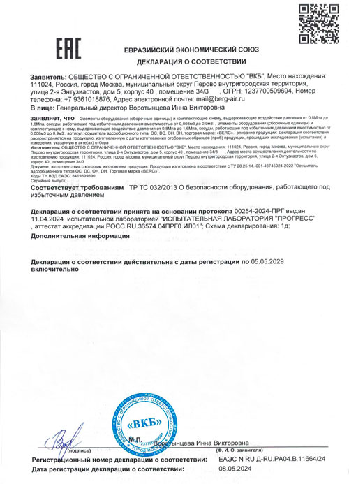 Декларация на адсорбционных осушители завода Berg подтверждает соответствие всем требованиям и стандартам качества.