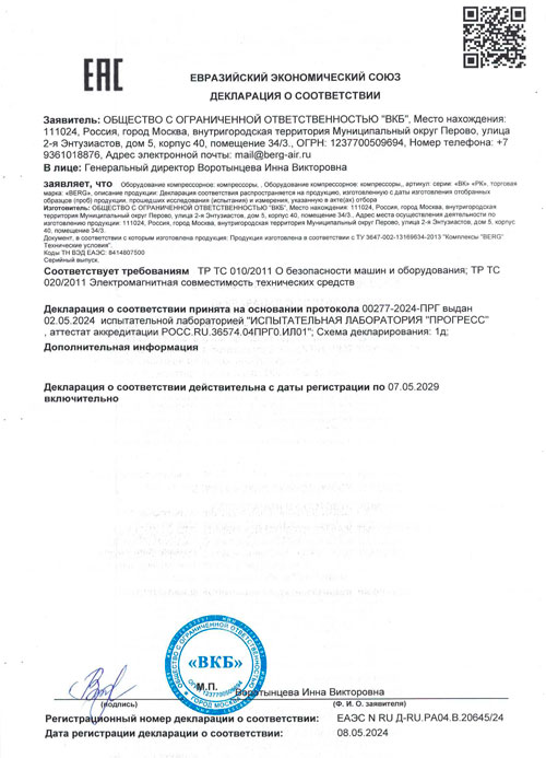 Декларация на винтовые компрессоры завода Berg подтверждает соответствие всем требованиям и стандартам качества.